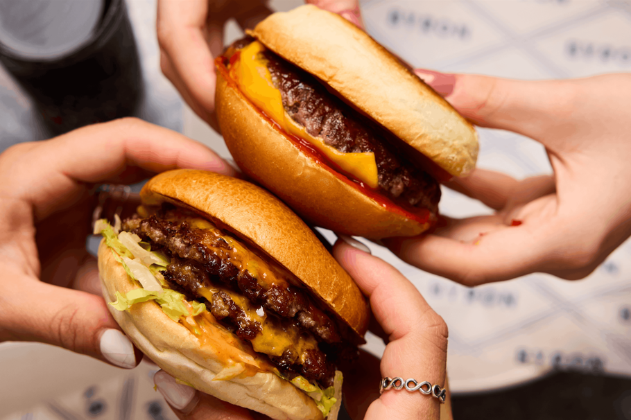 Double smashed dry-aged beef, American cheese, dirty sauce, grilled onions, pickles and shredded baby gem, indulgent, rich and utterly satisfying.